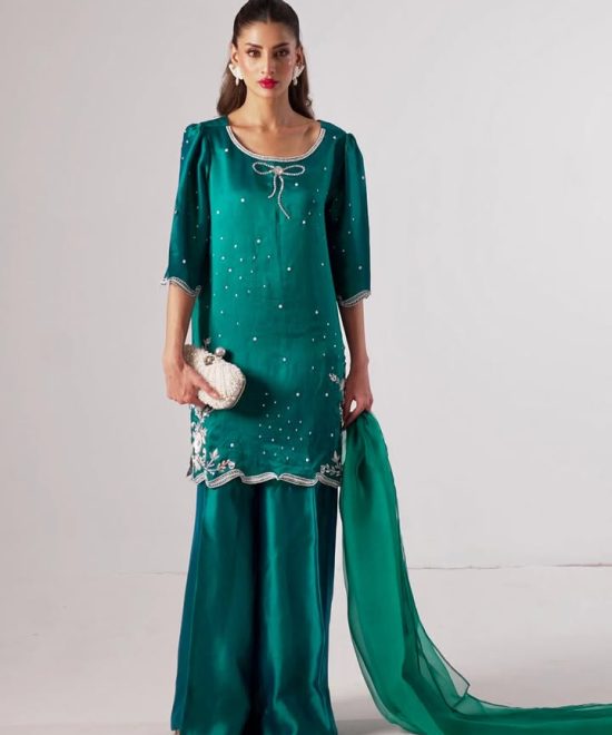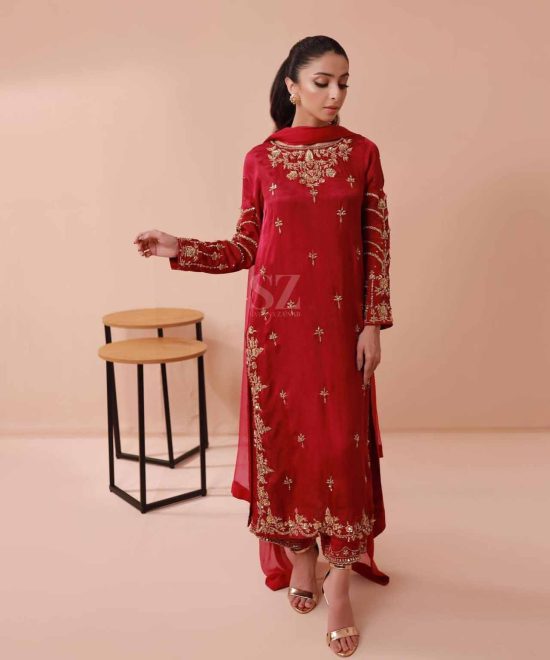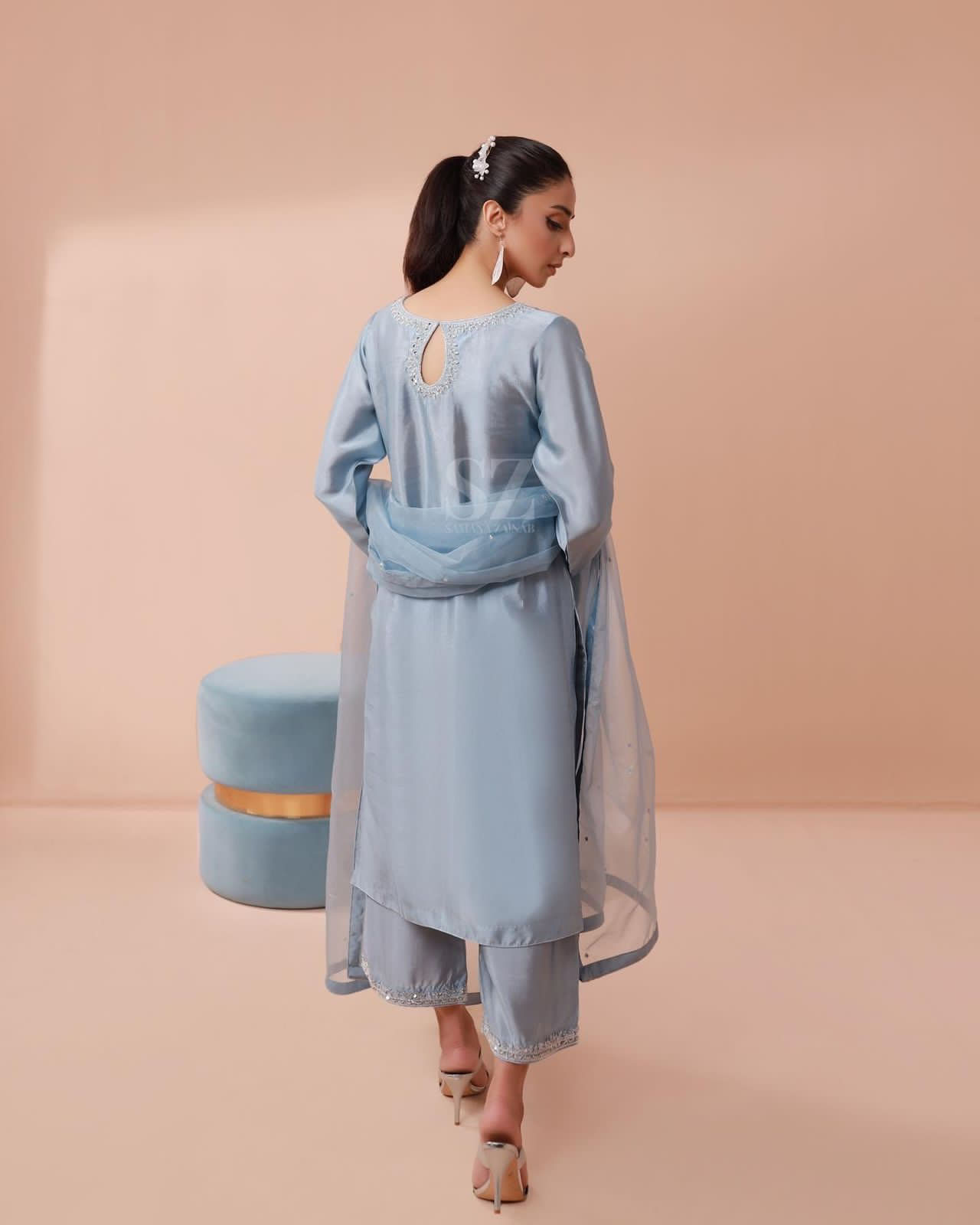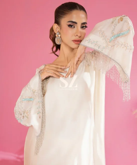 A beautifully detailed attire with hand embellishment of crystal, sequence, dabka and pearls.