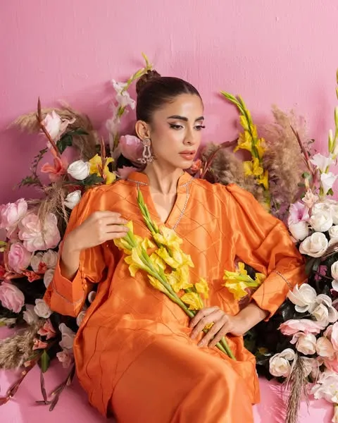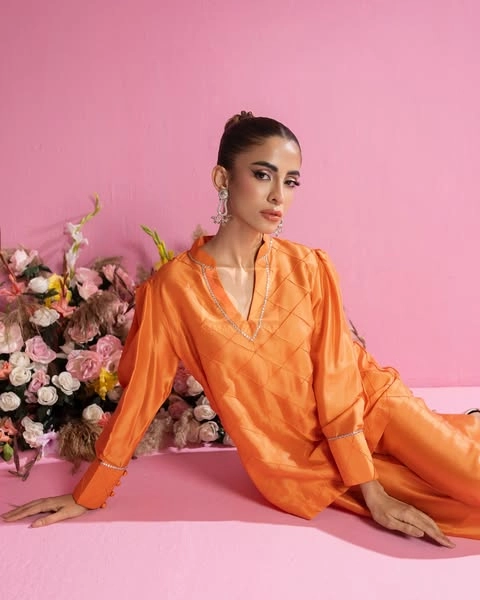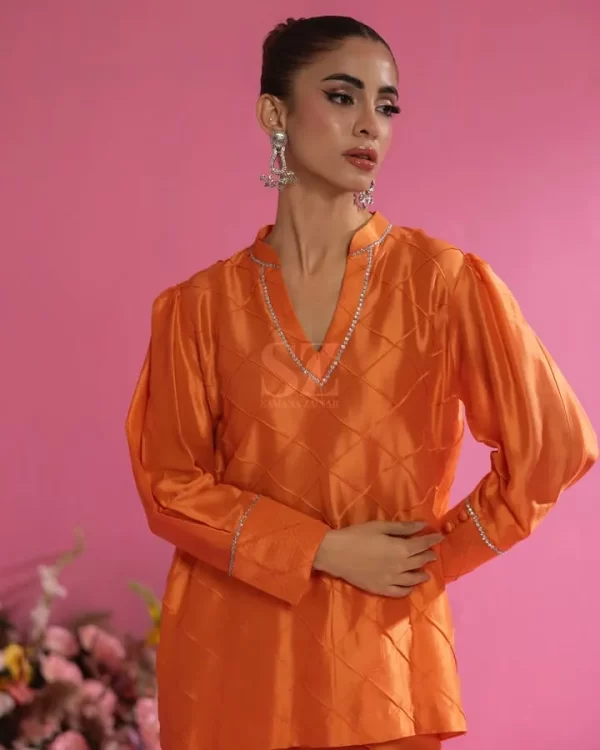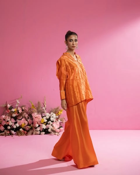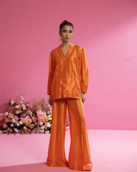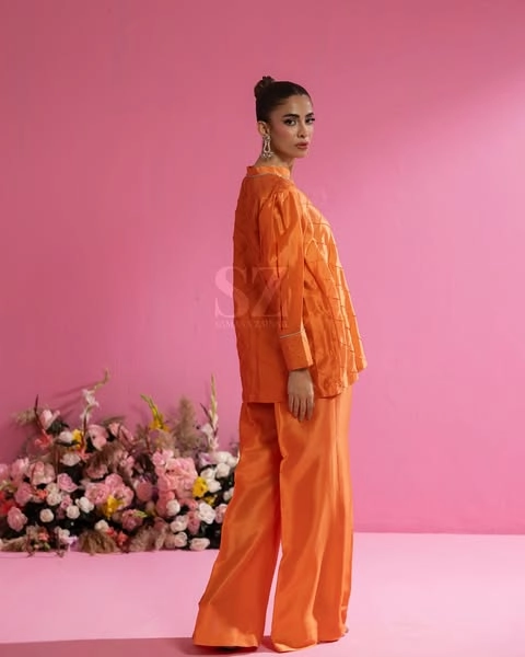 This vibrant peach ensemble, crafted from luxurious fabric with a subtle sheen.