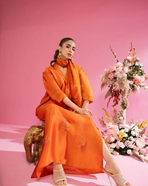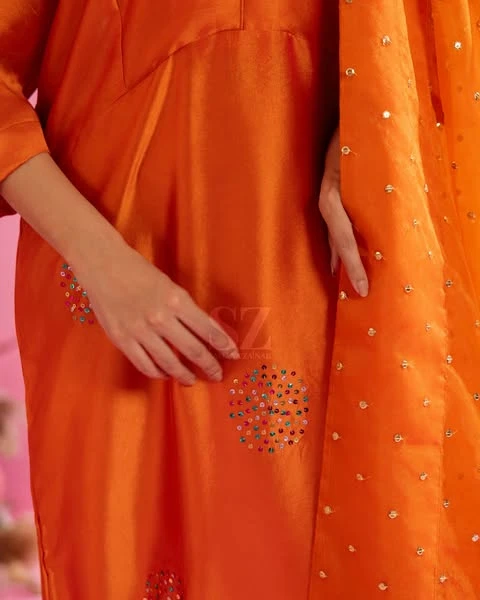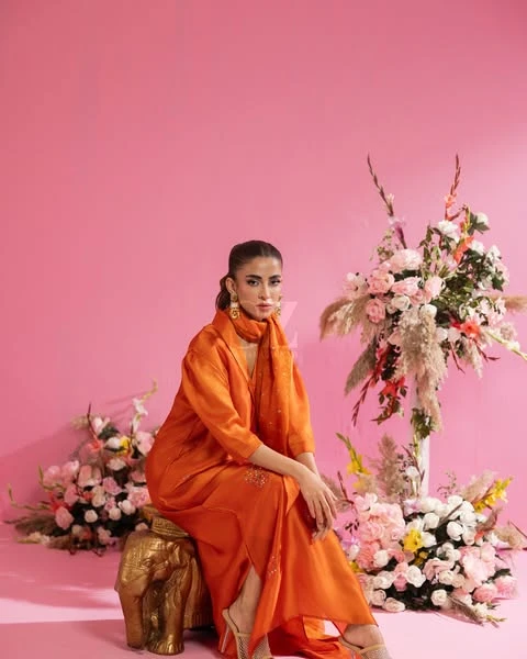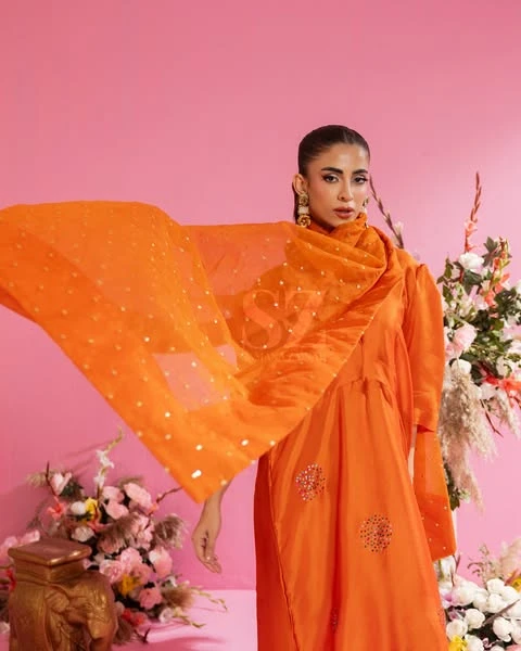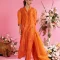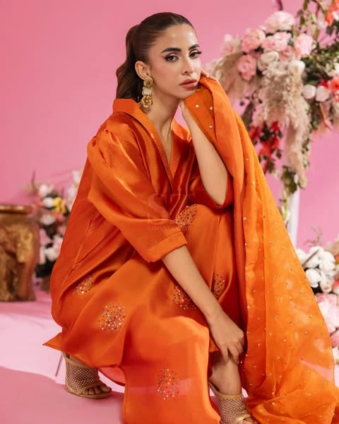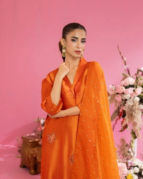 This luxurious kaftan-cut dress features a flowing silhouette with structured shoulders and a V-neckline, blending classic elegance with a contemporary Western touch. Adorned with delicate embellishments, the design exudes effortless sophistication.