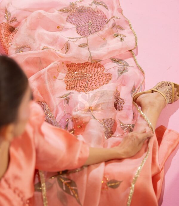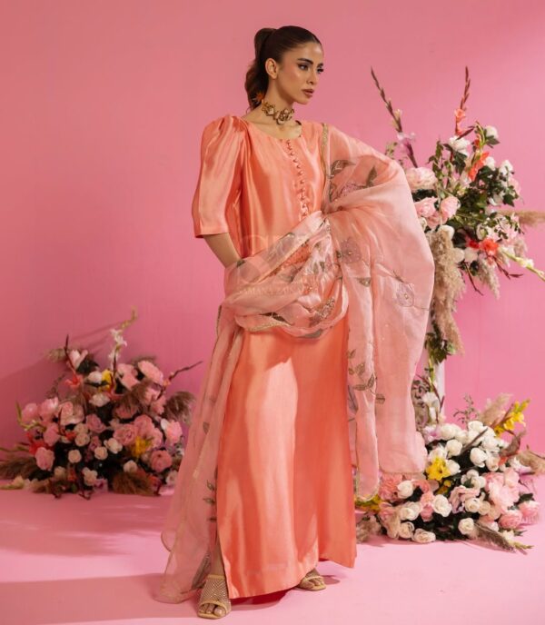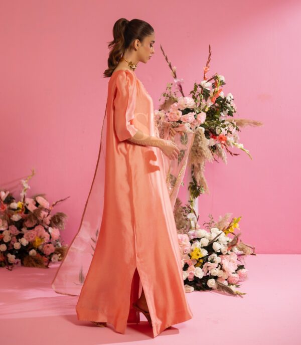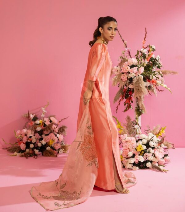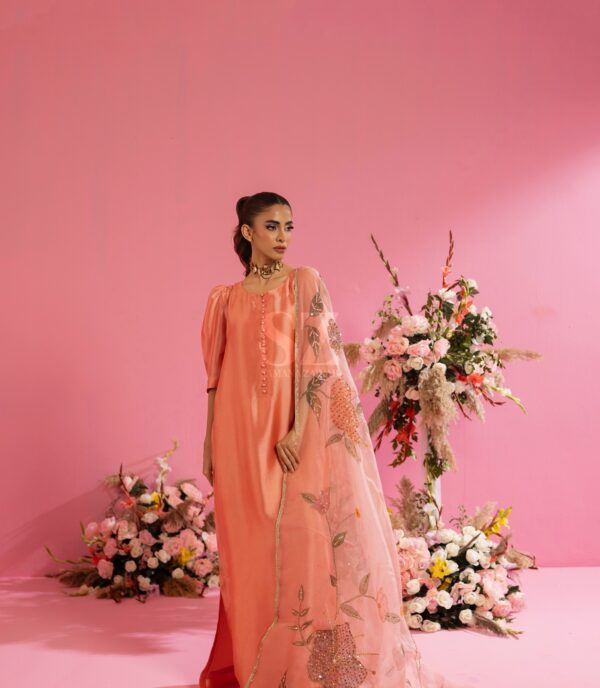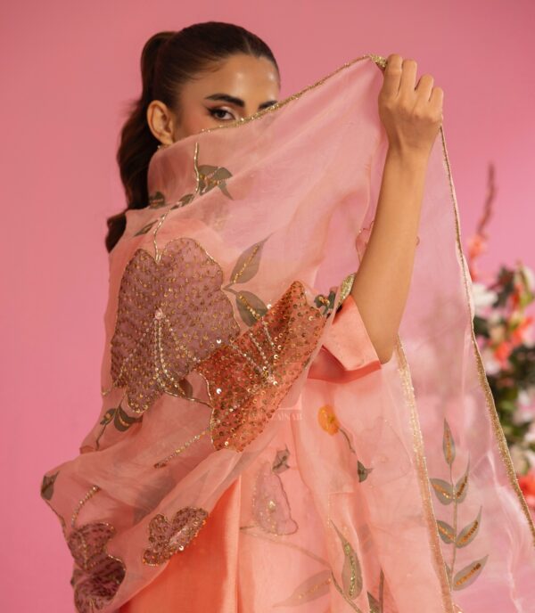 CORAL – Sunset Coral Straight Shirt with Hand-Embellished Floral Dupatta