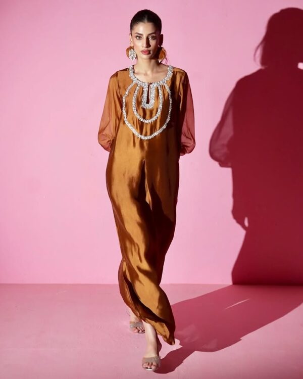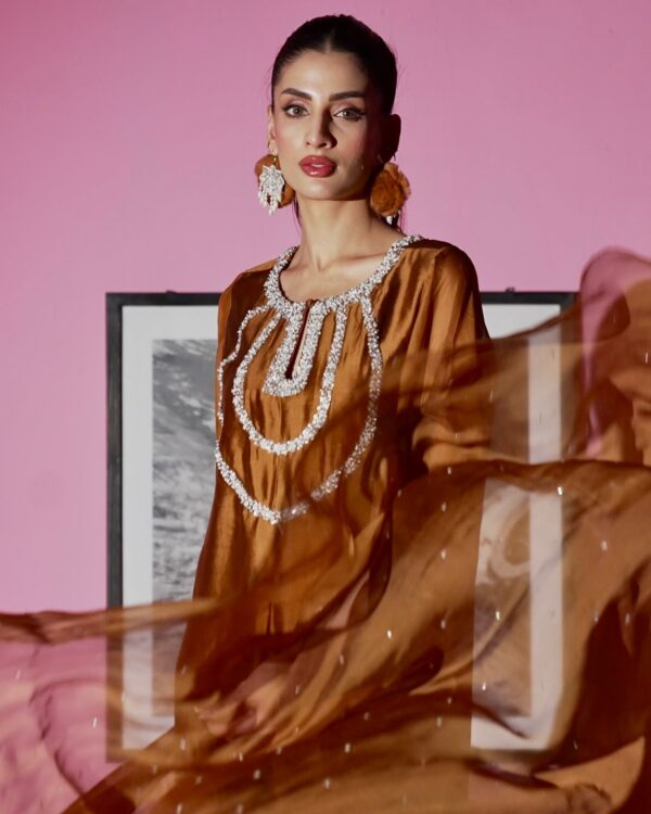 Grace with an edge—Élan features clean lines in flowing Shisha silk, elevated with minimal hand embellishment in necklace-style detailing and sculpted drapes. Paired with a soft dupatta, this refined two-piece makes a bold statement where tradition meets modern celebration.