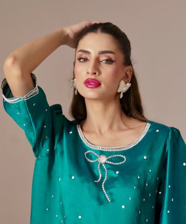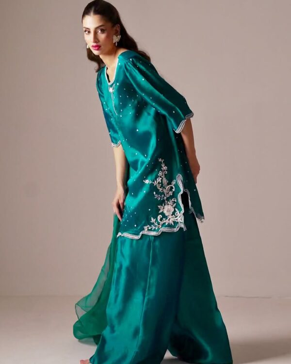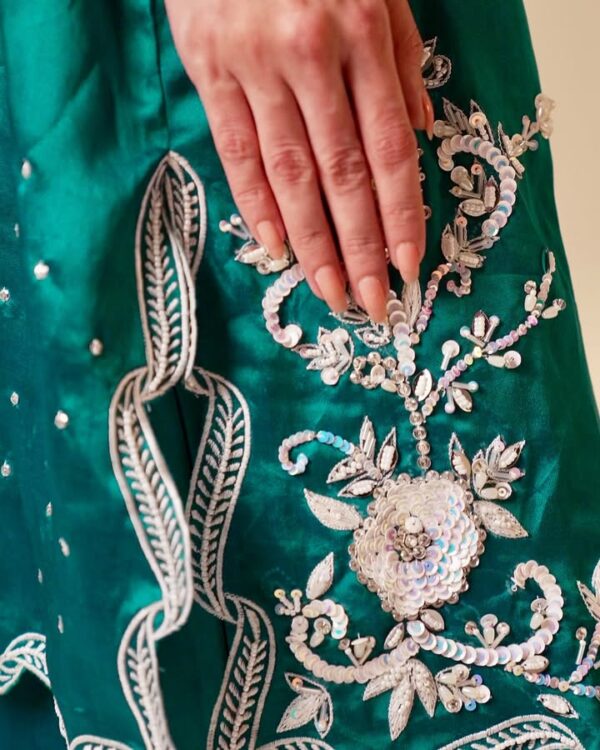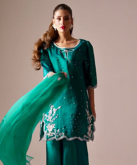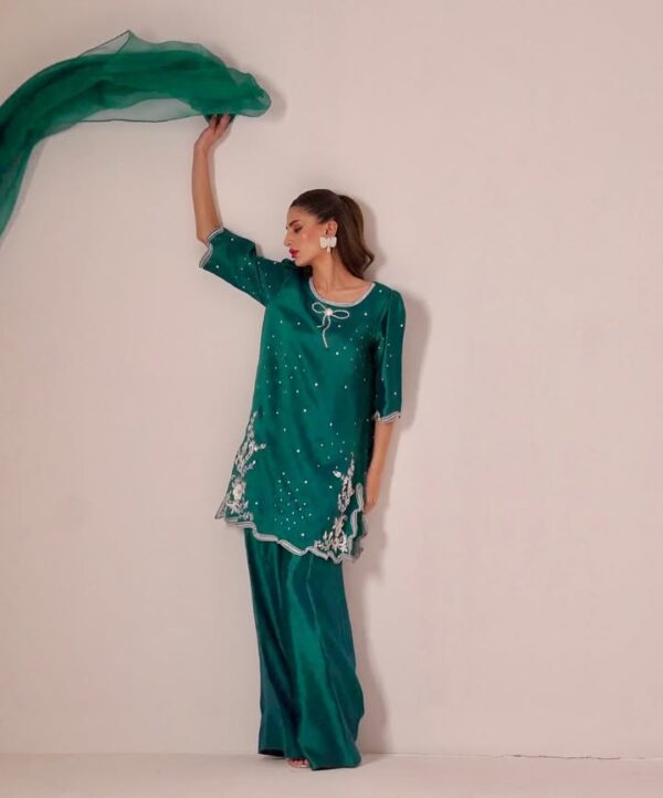Step into timeless elegance with our HIRAANI 3-piece outfit, crafted from luxurious Sheesha silk. This rich emerald green ensemble features a delicately hand embellished tunic adorned with detailing and subtle embroidery around the neckline and hem. The flowy wide-leg high waisted pants exude grace and sophistication, while the matching dupatta in pure organza adds the perfect touch of femininity.