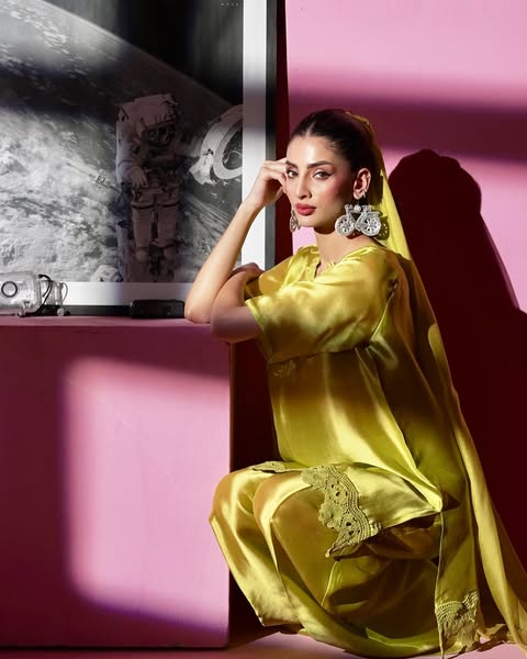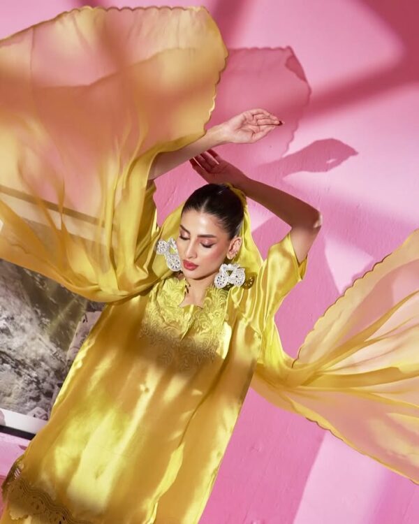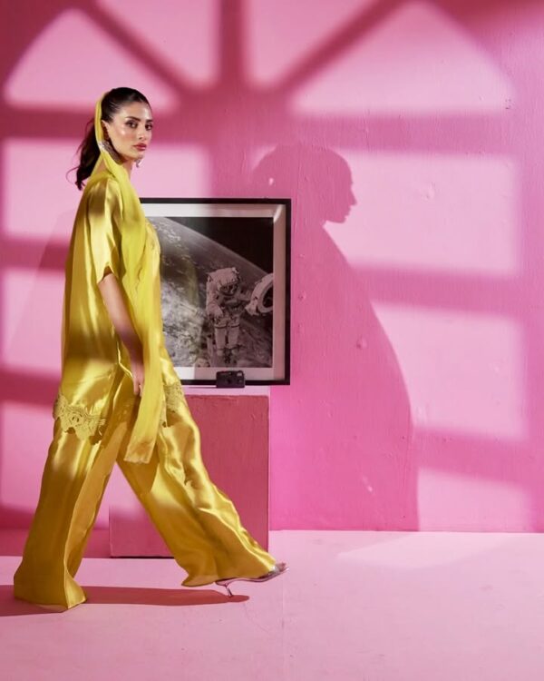 Soft and luminous LUNA glows in Parrot green shesha silk, accented with gentle aplic work and fluid layers. Dreamy, modern, and ethereal. paired with a soft long dupatta and high-waisted pants, this ensemble redefines modern elegance with a fresh, contemporary cut.