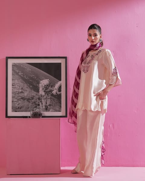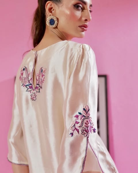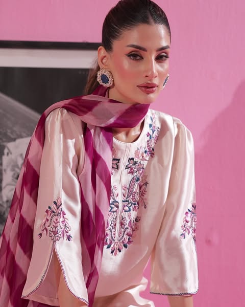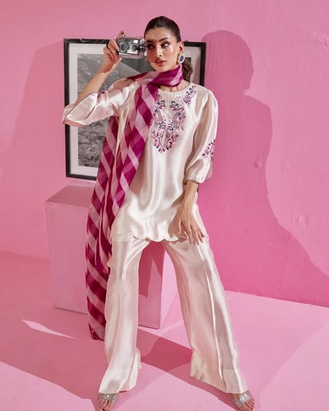 Designed luxurious sheesha silk, this stunning outfit features a delicately embroidered short shirt in a timeless pearl white hue. The intricate embroidery work adds a touch of sophistication and charm. Paired with a beautifully coordinated double-shaded dupatta, the ensemble brings graceful movement and contrast. This 3-piece set is perfect for festive occasions, formal gatherings, or elegant daywear.