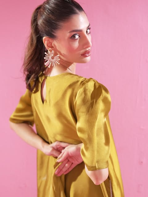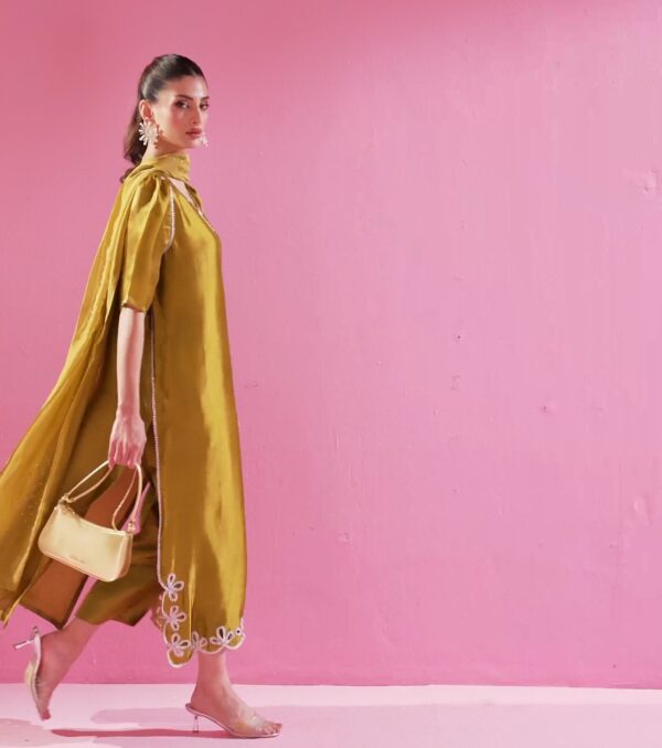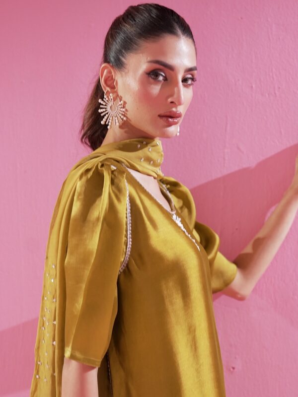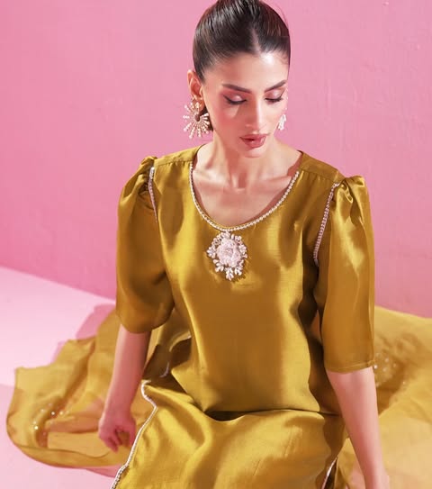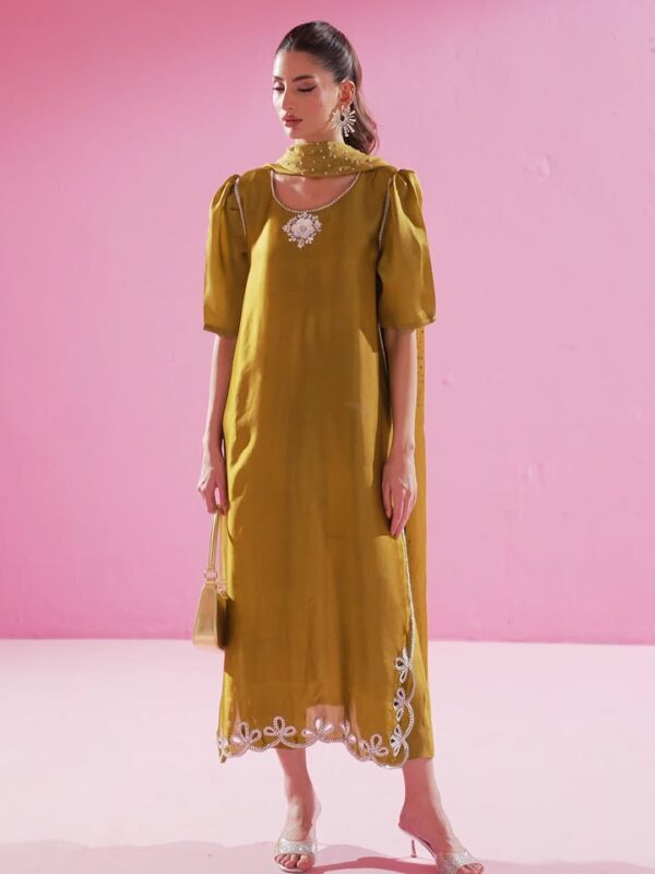 A delicate and refined silhouette in pure sheesha silk, this olive-toned ensemble features softly gathered puff sleeves, a hand-embellished neckline motif, and intricate floral embroidery along the hem. Paired with a pure organza dupatta adorned with polka mirrorwork, the look balances charm and sophistication—ideal for festive days, Eid brunches, or intimate gatherings.