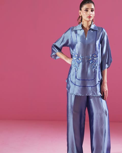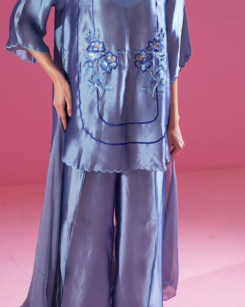 Step into soft sophistication with Opal Grace a pastel blue, 3-piece ensemble crafted from pure Sheesha Silk. Featuring delicate floral embroidery that adds subtle charm and feminine grace, this look captures the essence of understated luxury. Lightweight, flowy, and timeless perfect for serene occasions and intimate gatherings.