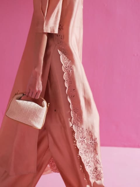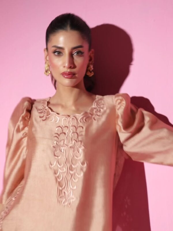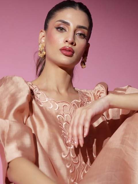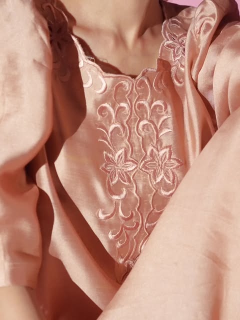 The silhouette features a relaxed straight cut with sculpted puff sleeves, elevated by delicate tonal threadwork. Intricate floral cutwork embroidery adorns the neckline and hem, infusing the piece with romantic refinement. Paired with a weightless pure organza dupatta, REYAAL embodies ethereal sophistication perfect for Eid, intimate soirées, or elevated festive dressing.