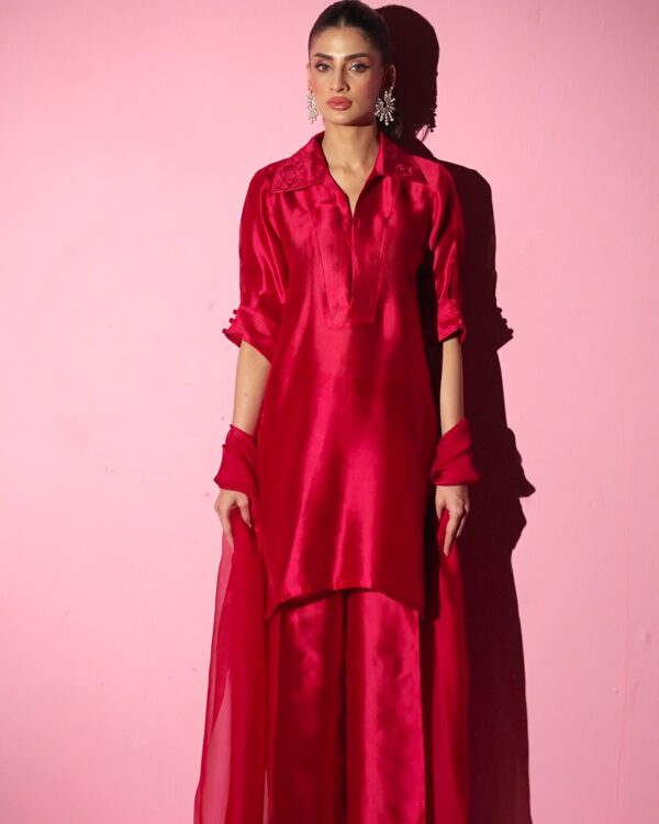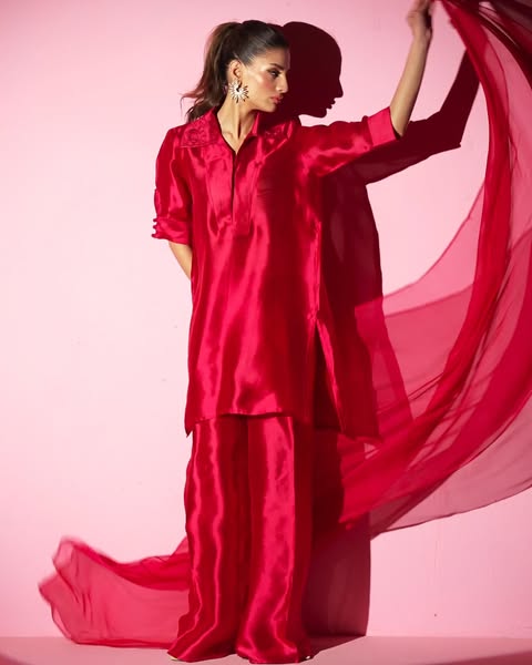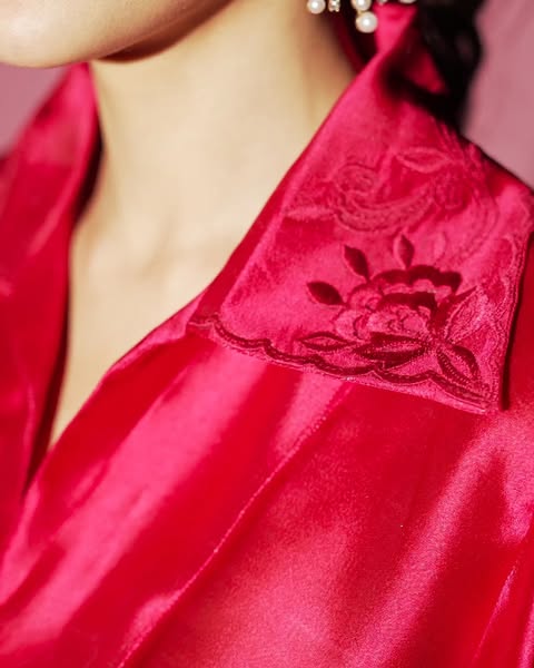Turn heads in our Rosé Royale a luxe 3-piece set crafted in Pure Sheesha Silk. Featuring a sleek high-waisted pant and modern embroidery detail on the collar, this look blends couture flair with contemporary elegance. Perfect for the spotlight.